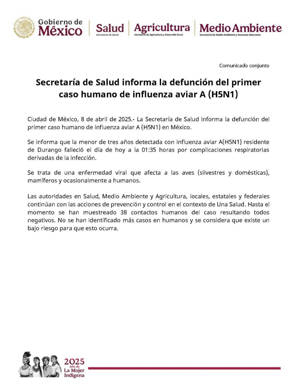 La Secretaría de Salud informa la defunción del primer caso humano de influenza aviar A (H5N1) en México.